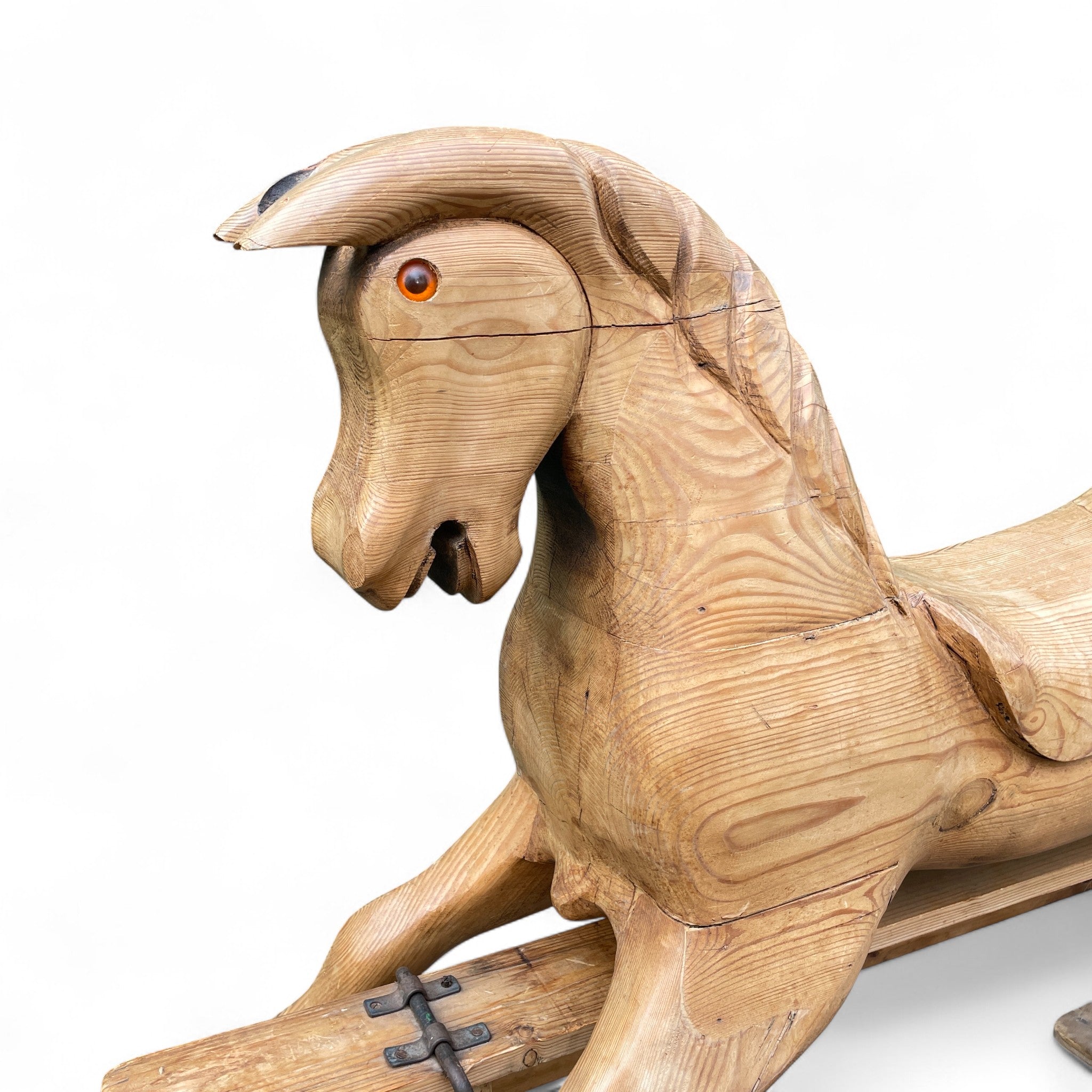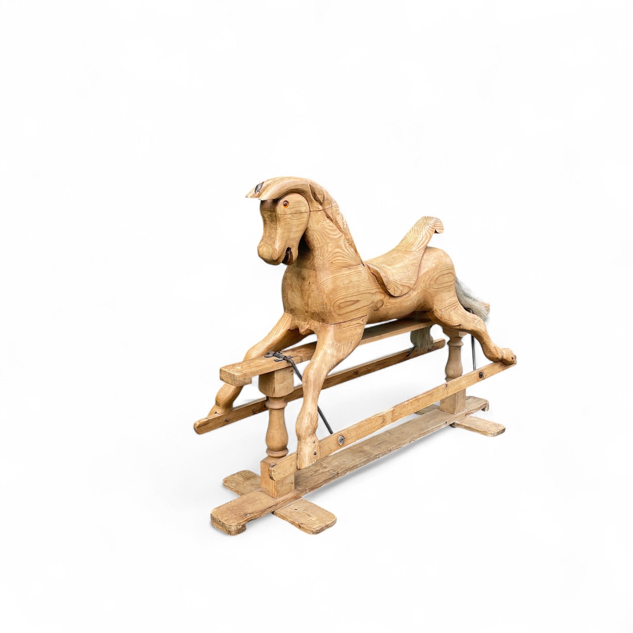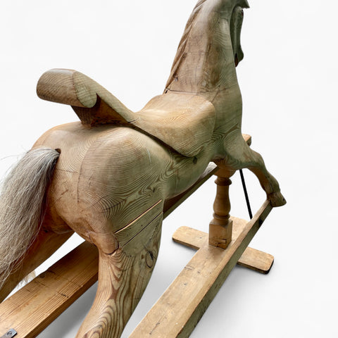 This stylish rocking horse on its stripped wood base is both elegant and fun. With its horsehair tail this magnificent piece is ready to find its new home.