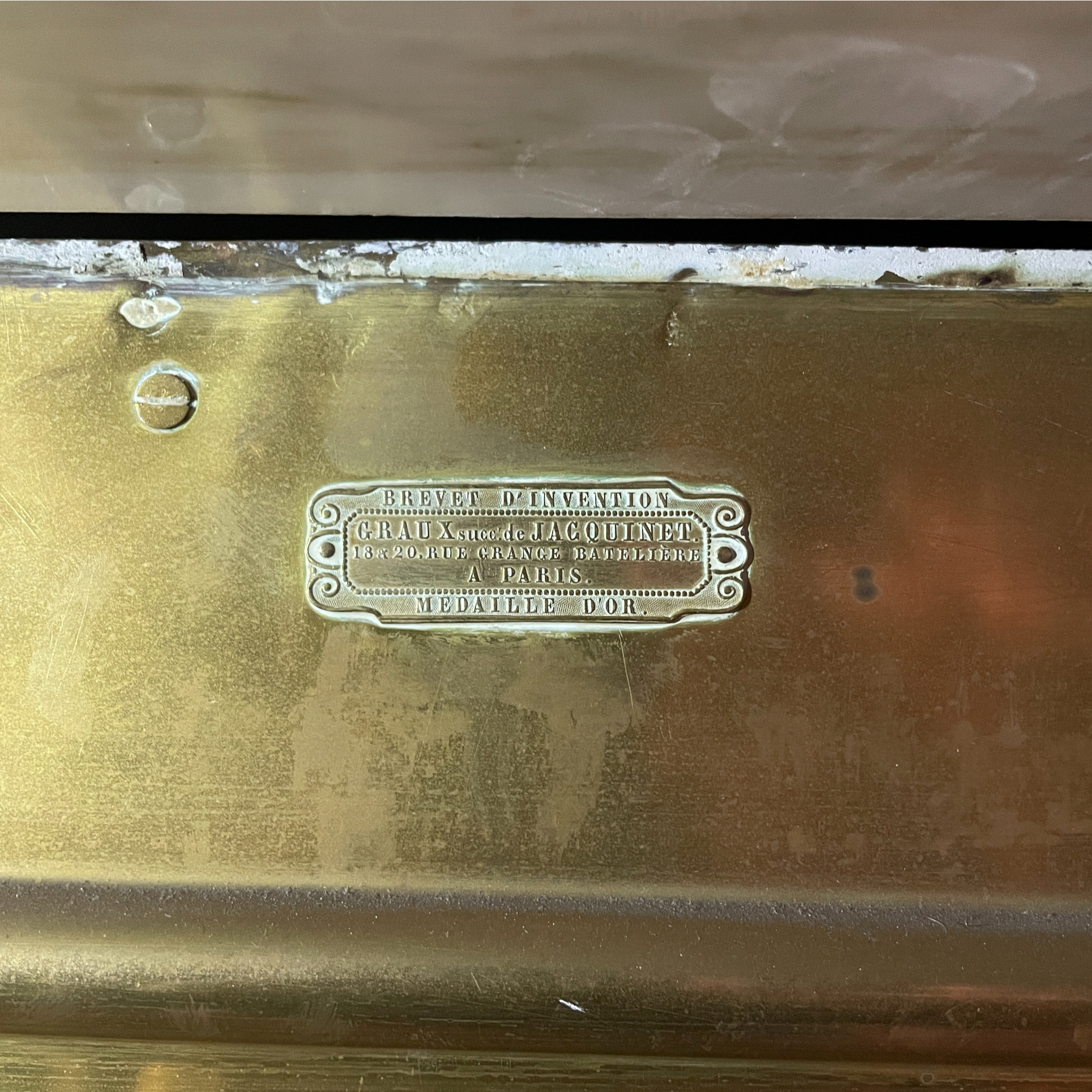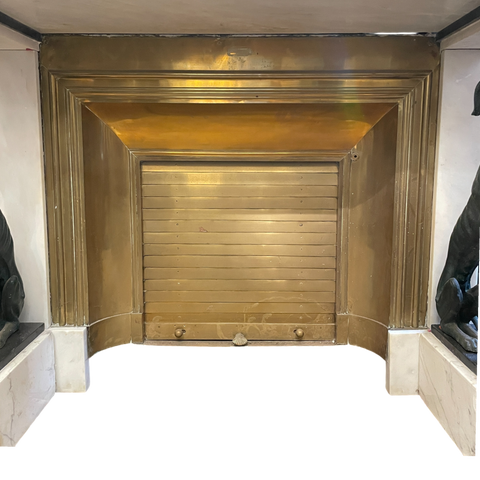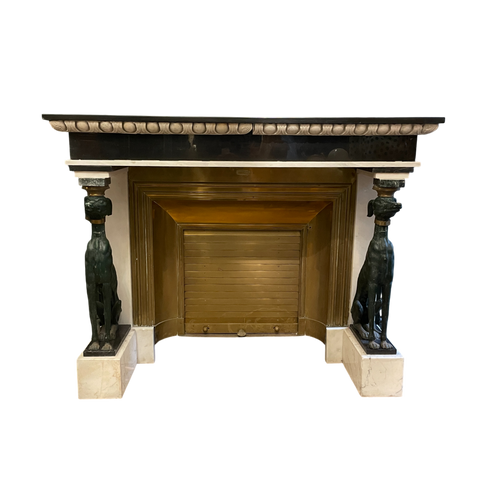 This striking fireplace features a pair of greyhounds flanking a Carrara marble and slate surround . The carved marble egg and dart frieze adding elegance to this extremely unusual fire surround. The surround is further enhance by the brass insert with louvered grate . The insert bearing a makers signature along with details of a gold award for design.
