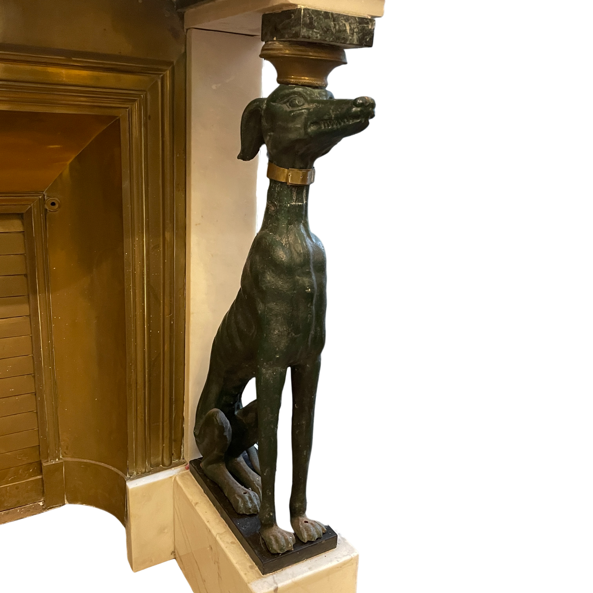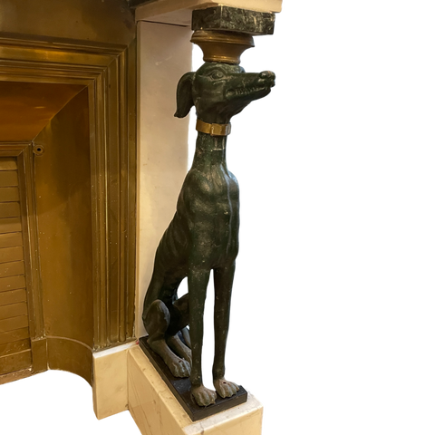 Striking French mid century fireplace flanked by two greyhounds.