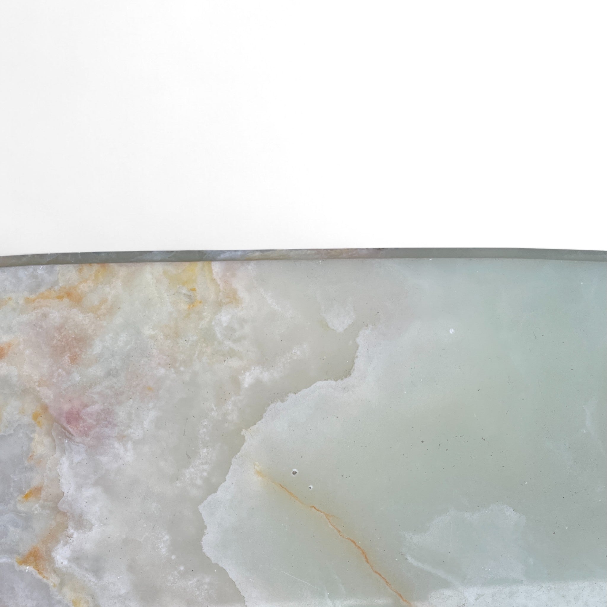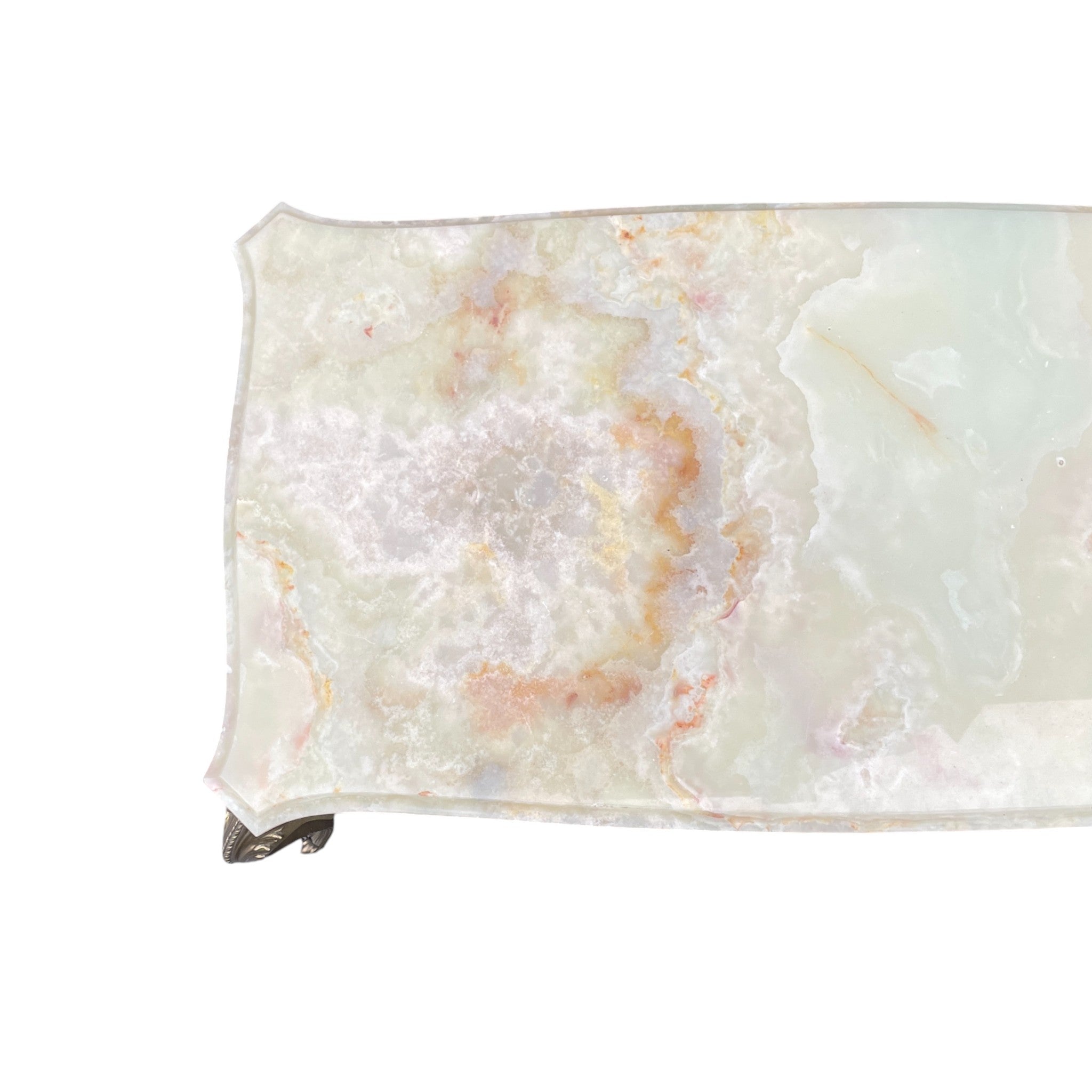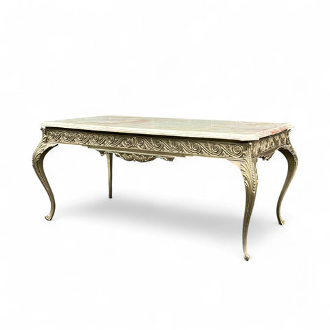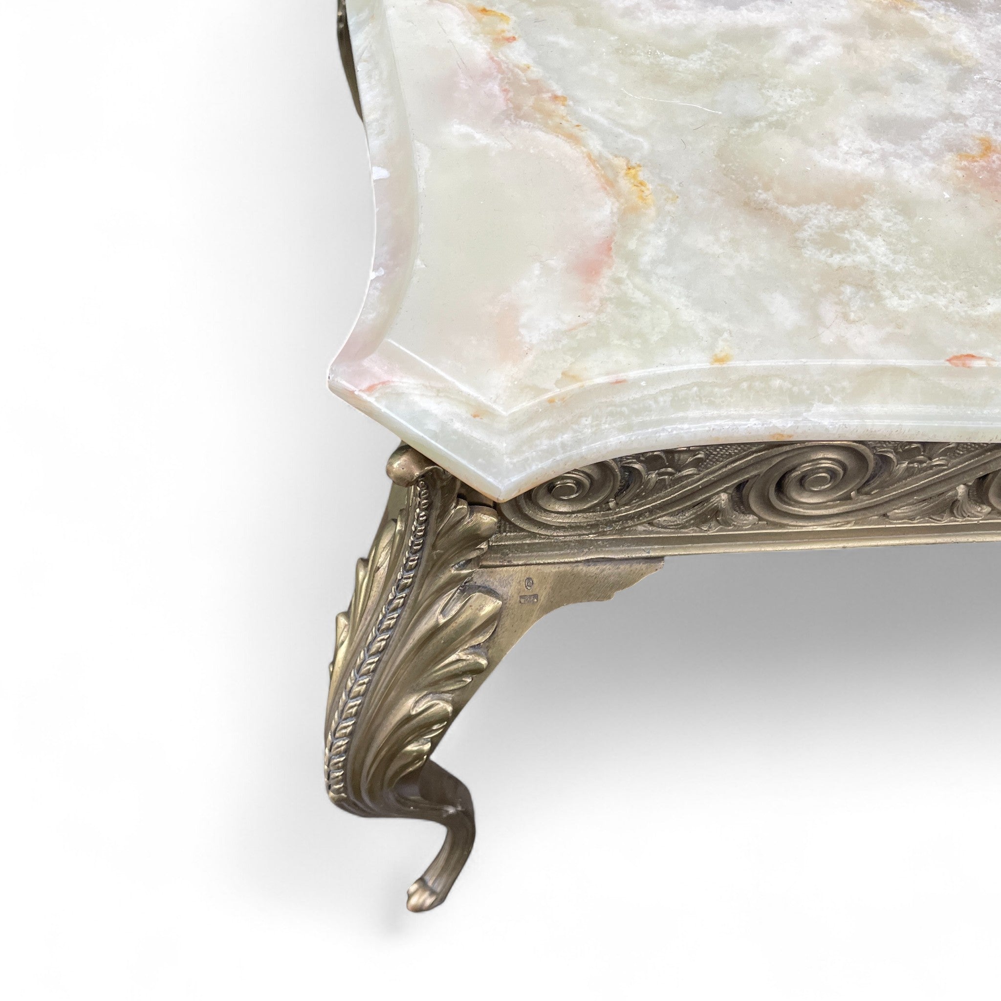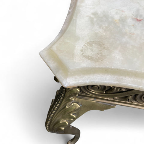 This elegant coffee table features a scalloped and bevelled onyx top set on a bronze base. The base signed with foundry marks. A super quality coffee table.