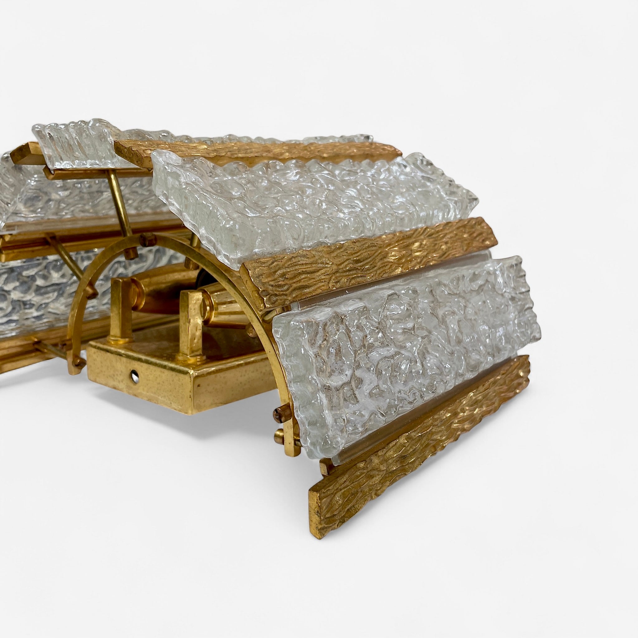 Decorative pair of 1970's gilt metal and glass wall lights .
