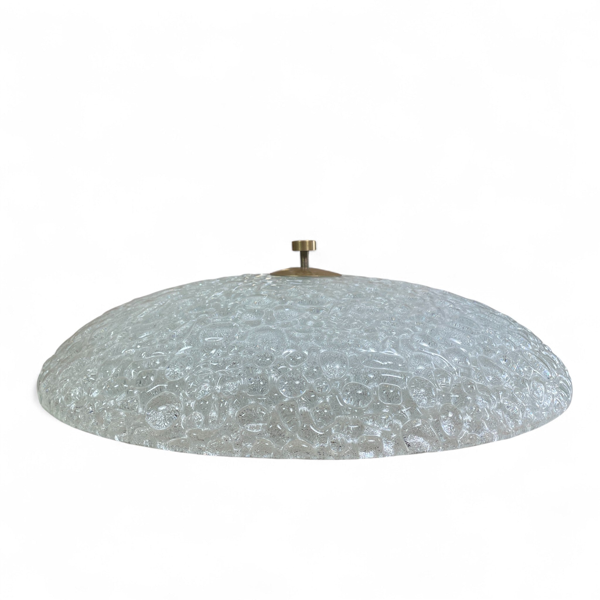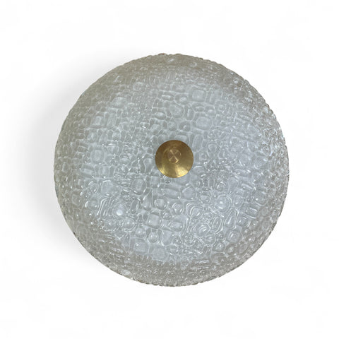 This large flush ceiling light is perfect for rooms with low ceilings or bathrooms.The decorative Murano glass dish supported by a brass finial . German circa 1970 . Pair available.
